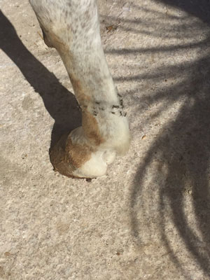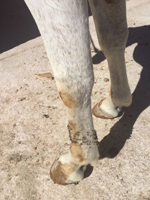 Sår opstået på ben efter spark, med flue aktivitet. Før montering af FlyTape