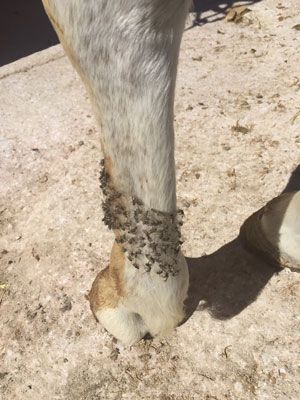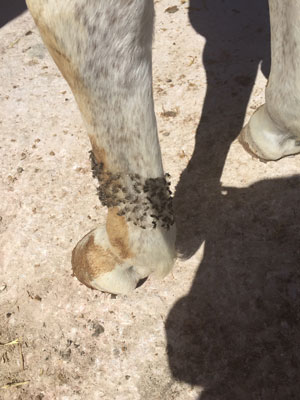 Irriteret hoppe hvor fluerne sværmer ved yveret
