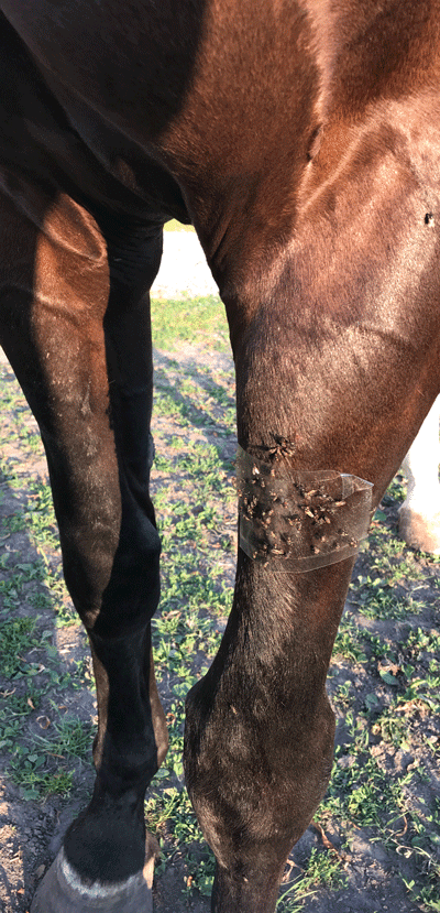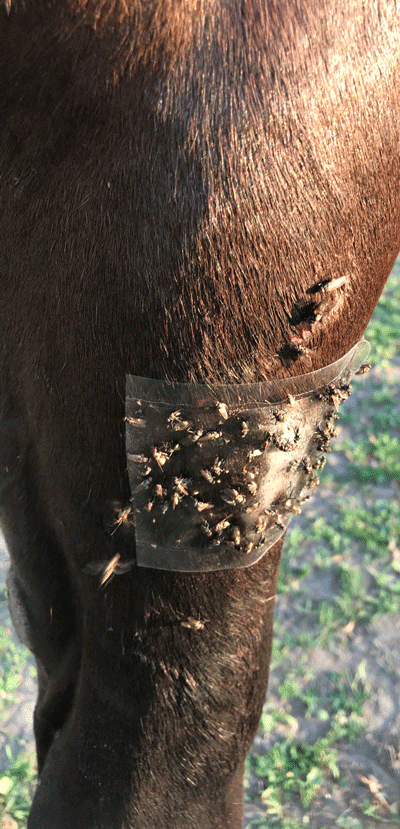 FlyTape er 57 cm langt og kan afklippes i en længde, så det kan nå hele vejen rundt om hestens ben. Mange fluer sværmer omkring hestens nedre ben med stor irritation for hesten som står og stamper.